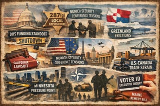 DHS funding standoff, 287g expansion, voter ID executive threat, and Europe hedging. A structural look at how federal power is embedding quietly.