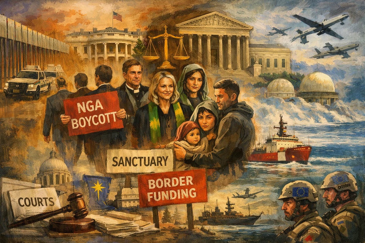 The structural pattern remains consistent: funding instability at the federal level, persistent immigration enforcement activity, state level resistance and cooperation battles, and alliance recalibration in Europe and the Arctic.