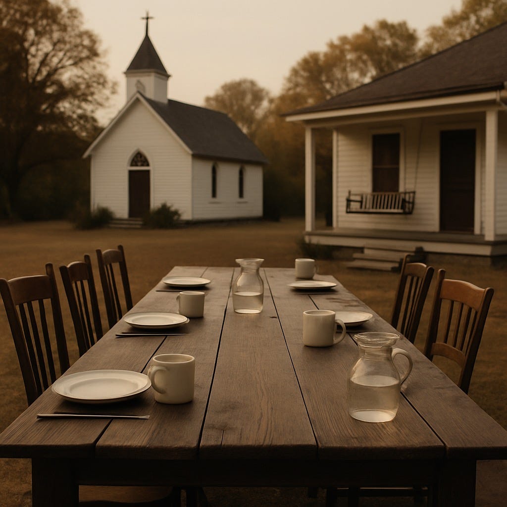 The Sunday stillness, the long potlucks, the second cup of coffee poured slowly at the community table.