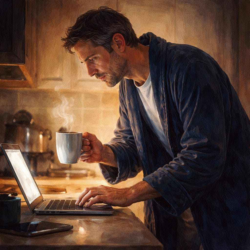I’m up early again. Earlier than I meant to be. The house is quiet in that soft, unfinished way, and I’m standing in the kitchen waiting for the coffee to remember who it’s supposed to be.
