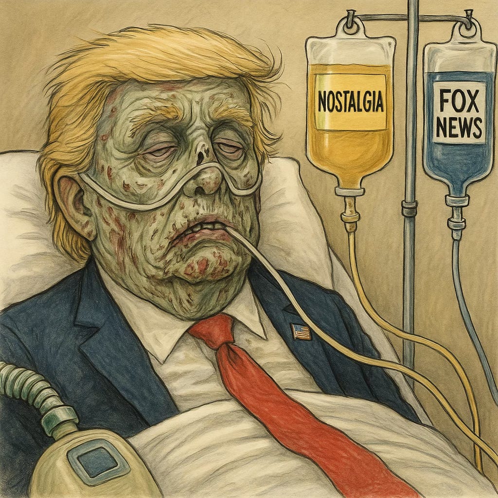 Now the tubes keep the limbs moving. One pumps nostalgia. Another pumps fear. A third pumps whatever Fox News has mixed in the back room that evening. These tubes don’t give life. They give animation. They keep the face twitching and the mouth forming something that resembles sentences. They keep the brand alive even though the soul slipped out years ago.