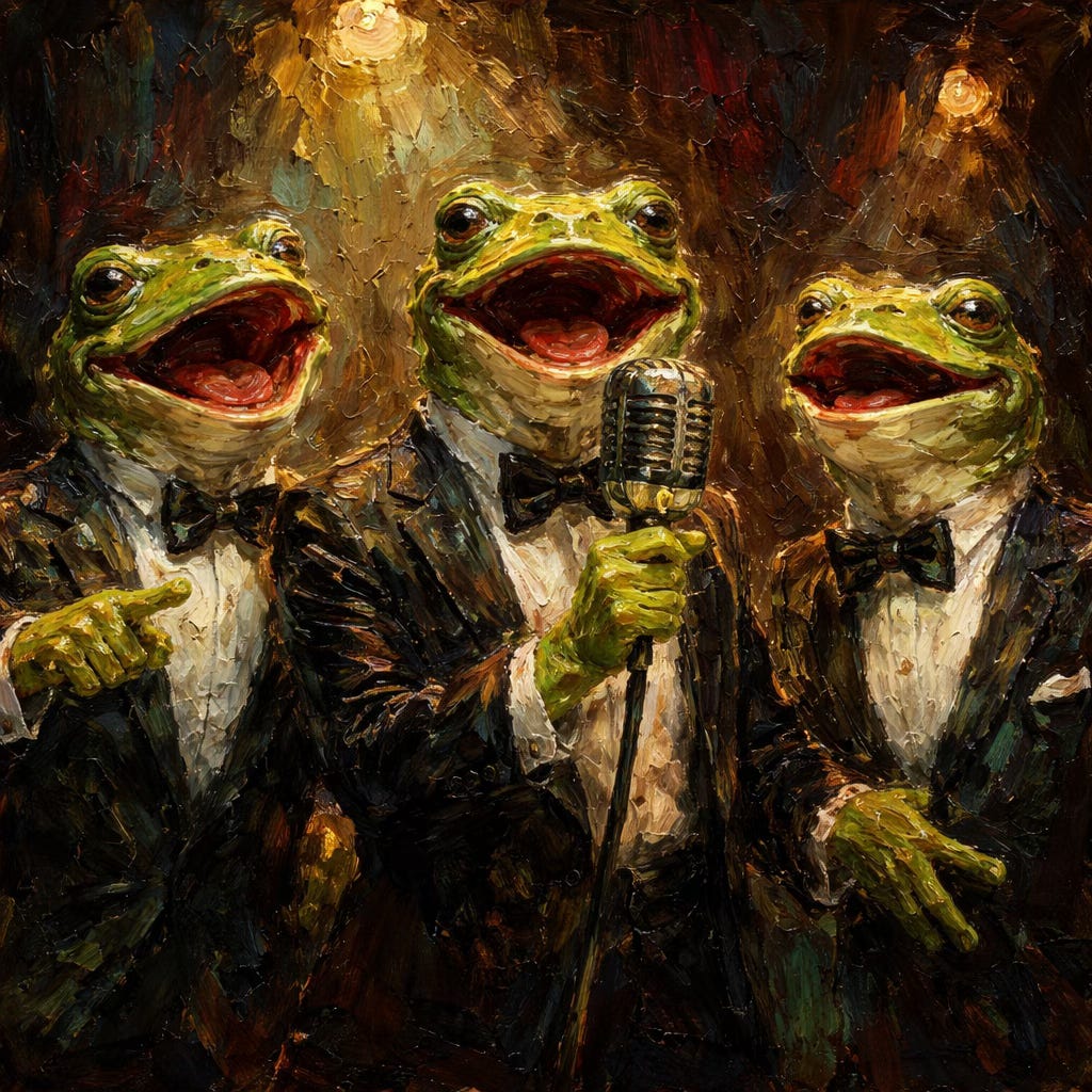 The frogs chant nonsense with perfect rhythm.
