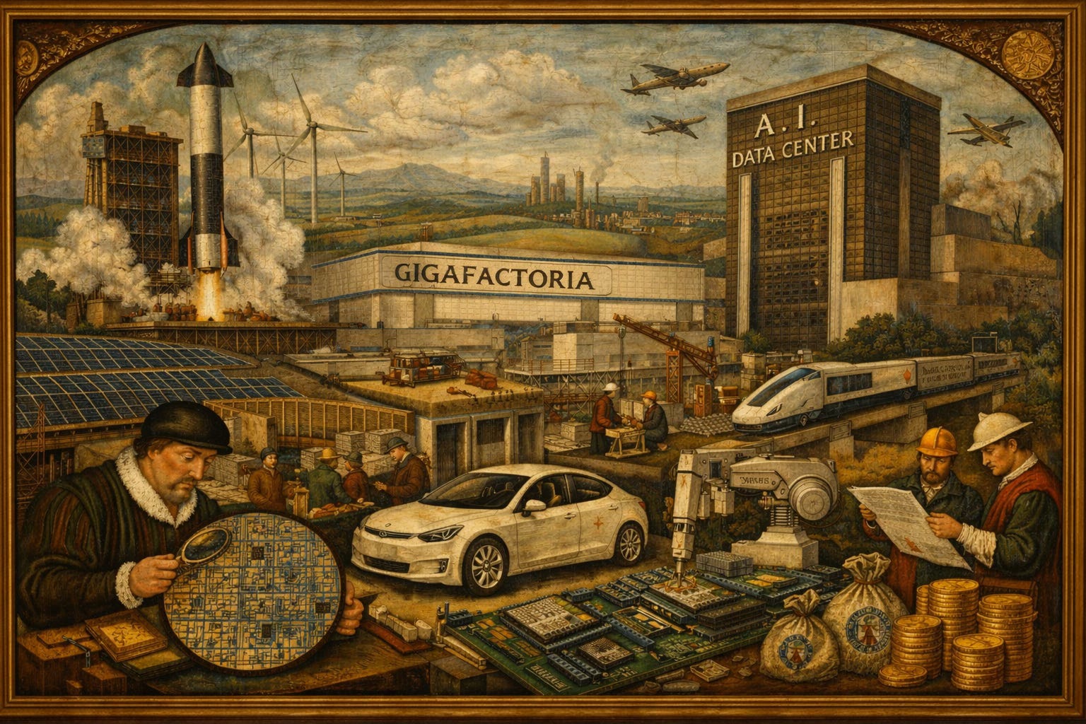 In one frame, semiconductor plants rise from desert soil in Arizona. Battery megasites reshape farmland outside Savannah. AI data centers expand across northern Virginia in quiet, humming rows. Billions in concrete and steel. Crews working around the clock. Federal backing that signals this will be finished.
