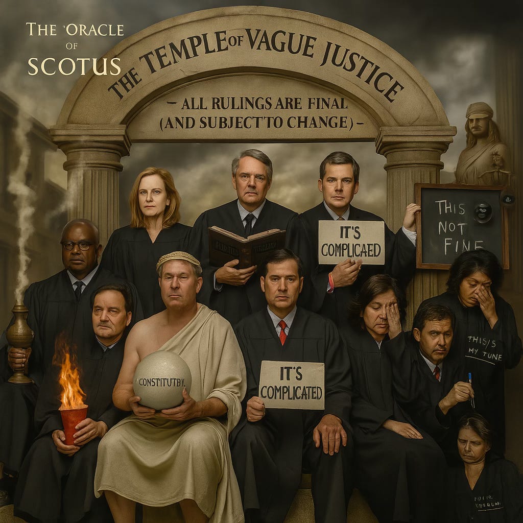 The modern Court doesn’t just rule—it performs. They drop 70 pages of majority opinion like a smoke grenade, filled with words like “textual fidelity,” “historic grounding,” and “legitimate ends.” Meanwhile, the real decision sits in the footnotes, hiding behind a velvet rope like it’s Banksy.
