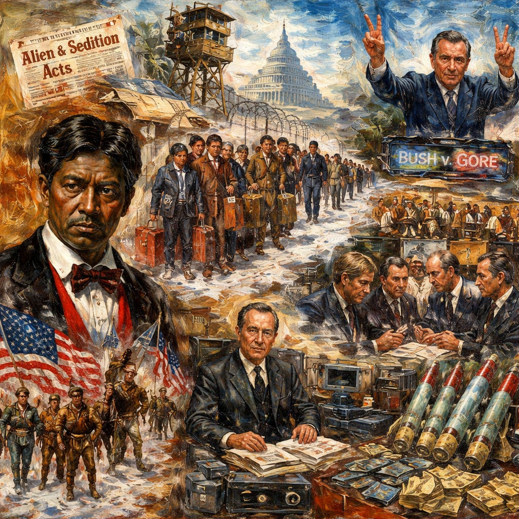 The Alien and Sedition Acts didn’t shut down daily life in 1798. Japanese American internment didn’t disrupt most households in 1942. A Supreme Court decision declaring that some people had no constitutional standing didn’t halt commerce in 1857. In each case, the routines held. The danger hid elsewhere.